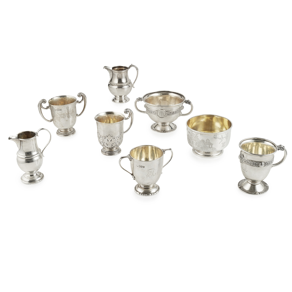 to include; an Irish Celtic inspired twin handled bowl and mug, Wakely and Wheeler, Dublin 1916, plain moulded rims, beast clasped handles, Celtic bosses and border, engraved inscriptions, both on pedestal foot; two cream jugs, one Brook and Sons, Celtic boder, the other plain; a Victorian bowl, Martin Hall, Sheffield 1879, engraved Chinese scene of willow pattern; a christening mug, Wakely and Wheeler, applied cut card work, reeded pedestal foot; two other christening mugs, with twin handles, engraved inscriptions, pedestal feet (8)