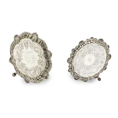 William Peaston London 1754, of shaped circular outline with shell and scroll border, the centre chased with foliate and scroll border and armorial to centre, raised on three hoof feet; the other William Bennett, London 1829, similar to previous, engraved crest, also raised on three hoof feet