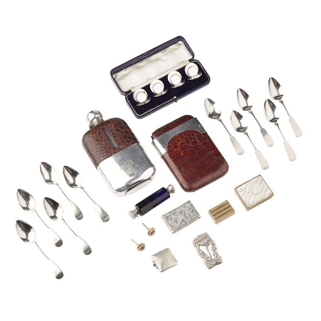 James Lockhart Spencer, Glasgow 1827, of Fiddle pattern, pointed bowls, engraved initials to terminal; together with a cased set of four menu holders, Chester; a silver mounted leather cigar holder; a mother of pearl box; a pair of gem set cufflinks stamped 18K, and a variety of vesta cases, snuff bottles, large hip flask etc. (qty)