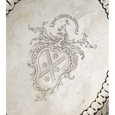 Upon the balance of probability and without any evidence to the contrary these armorial bearings reflect a kinship with the family of Napier of Ballikinrain in the County of Dumbartonshire. Given the presumed date of manufacture of this teapot stand its owner may have been a cousin to John Napier of Ballikinrain (died October 1784), the 13th of Ballikinrain and his wife, Janet Buchanan, the daughter of Moses Buchanan of Glinns in the County of Stirlingshire. Sadly, there is a dearth of genealogical information upon the branches of the particular branch of the Napier family that would