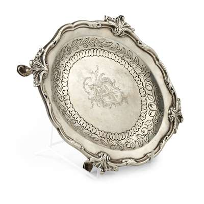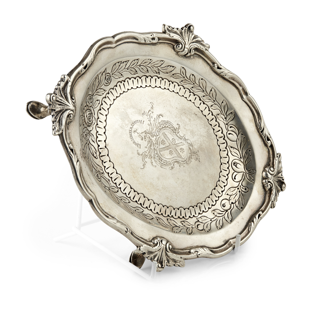 James McEwan, marked JMc, Glasgow town mark, JMc, S, of shaped oval outline with finely cast foliate and shell border, the well with chased fruiting foliage and arched borders containing engraved armorial, raised on four hoof feet