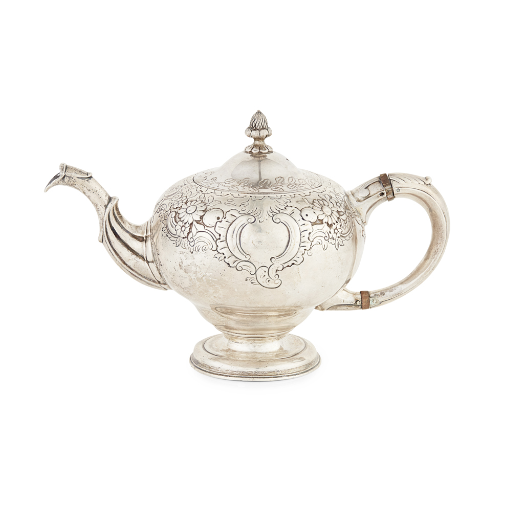 M&Co (un recorded) marked to base M&Co in script, M&Co in script (maker's mark), S, of inverted pear shape with chased floral, fruit and scroll border, twin scroll formed cartouche, with fluted slender S spout and simple acanthus leaf capped C scroll handle with wooden insulators, the hinged lid with engraved trailing foliate and bud finial