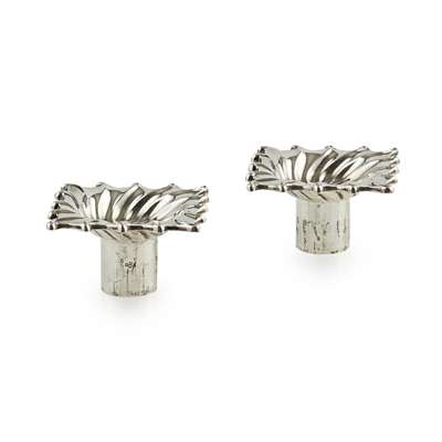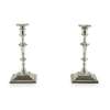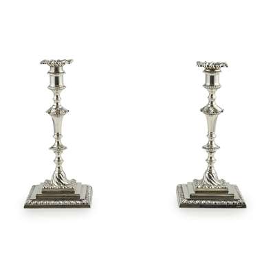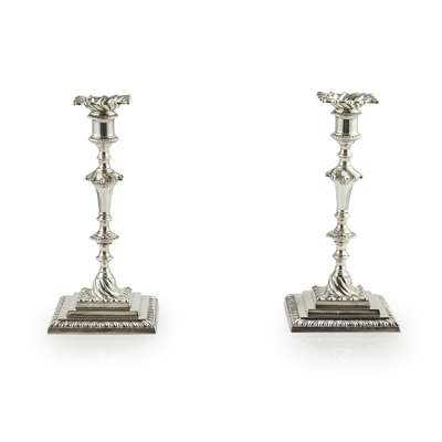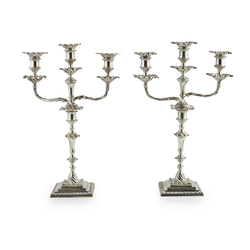 Hamilton & Inches, Edinburgh 1898, comprising two three light candelabra and two table candlesticks (the candelabra converting to match table candlesticks), the multi knopped stems with beaded and fluted detail and plain socket, the pull out sconces of shaped outline with fluted design, the whole raised on a semi-spiralled fluted domed section and stepped and gadrooned base, the candelabra arms of naturalistic form with central light and twin arms