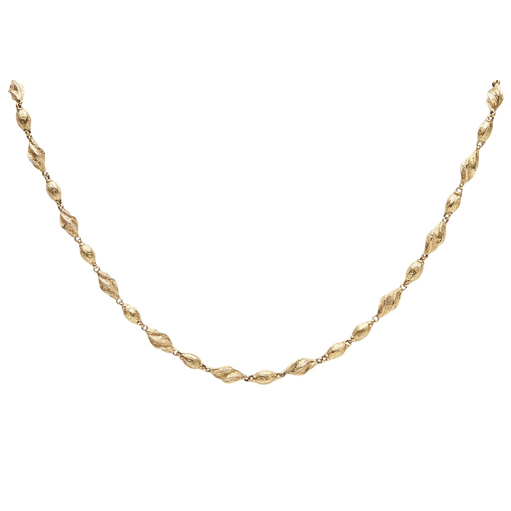 composed of alternating scrolling and ovoid engraved links, to a box clasp, unmarked