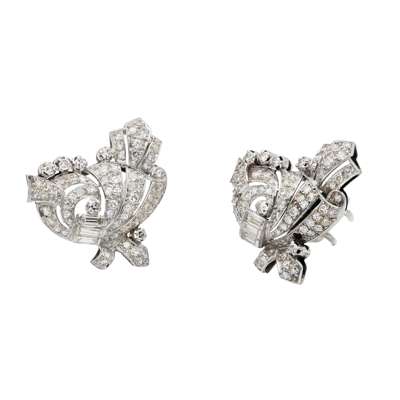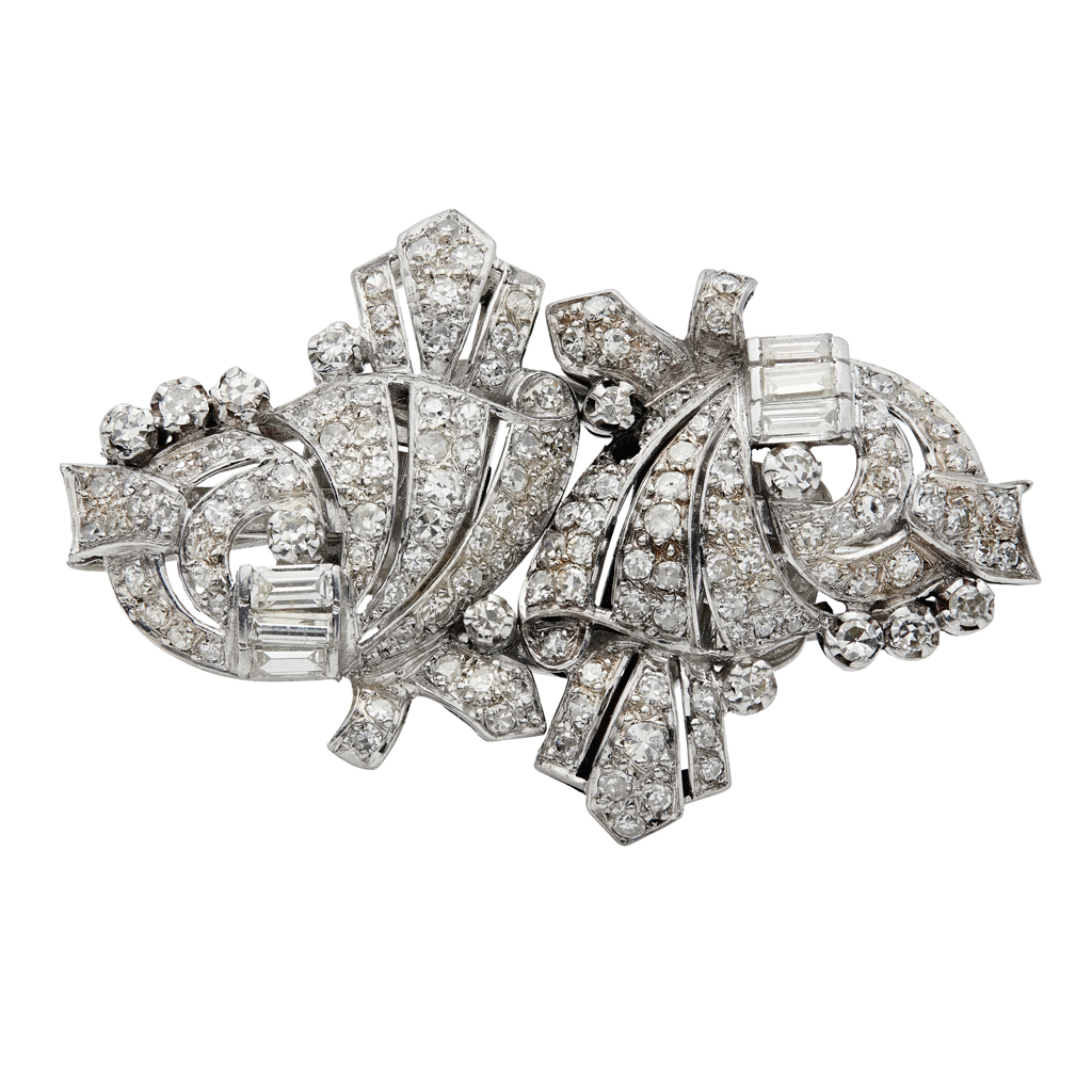 of pierced scrolling design, set throughout with graduated eight cut, round cut and baguette cut diamonds, to a detachable frame, unmarked