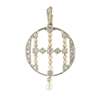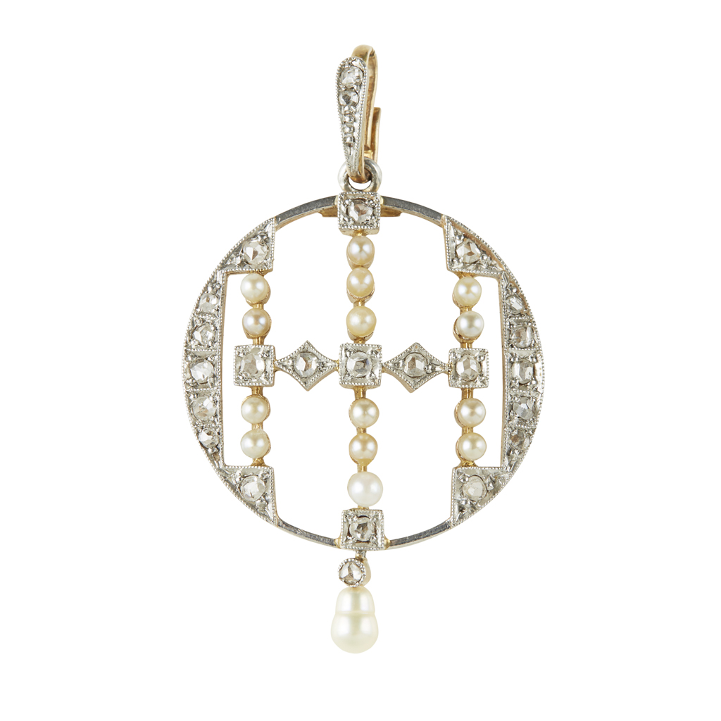 of circular open design, composed of rows of millegrain set diamonds and seed pearls, the central band of geometric design, the bale similarly set with diamonds, unmarked