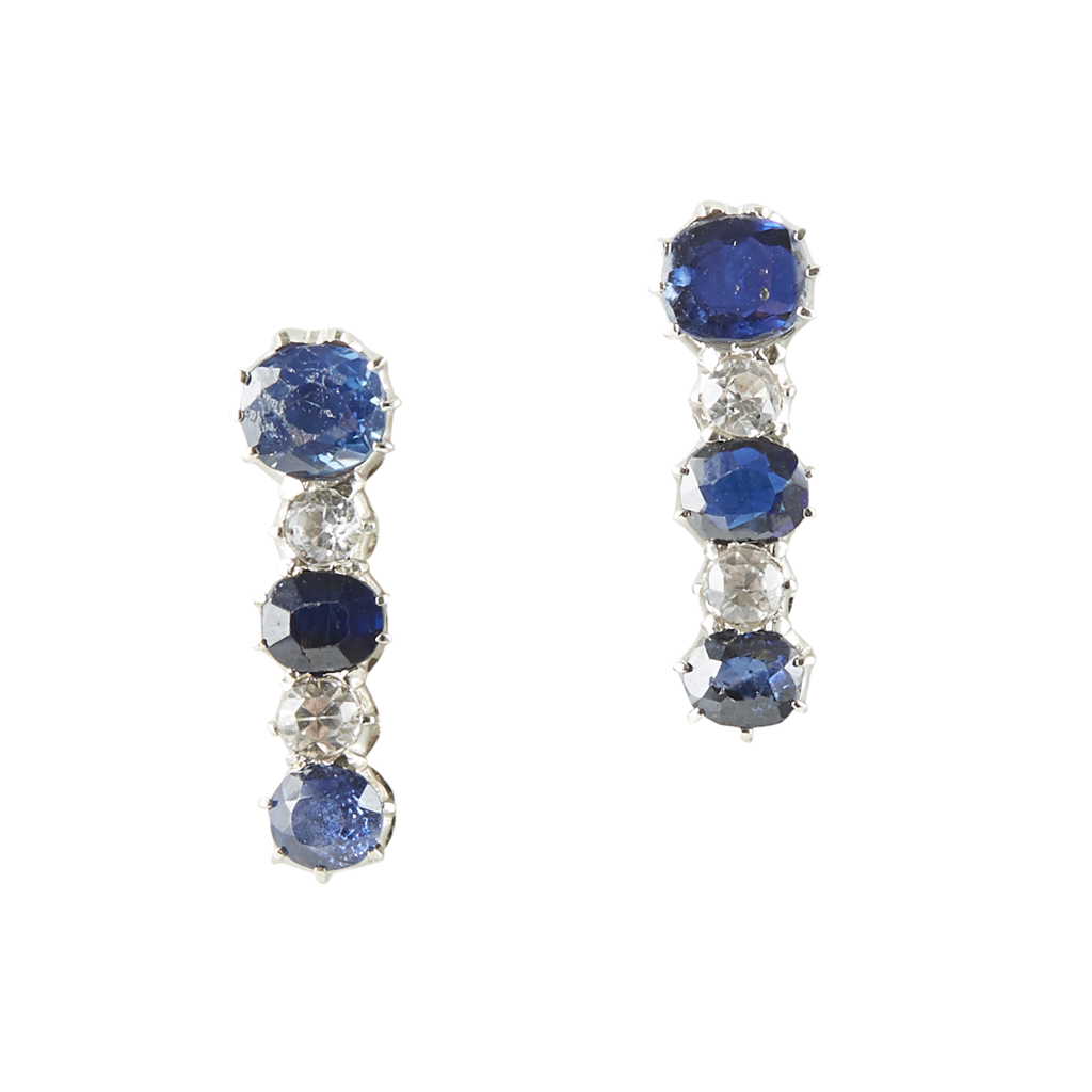 claw set with a graduated row of alternating blue and white sapphires, to post and butterfly fittings stamped 750