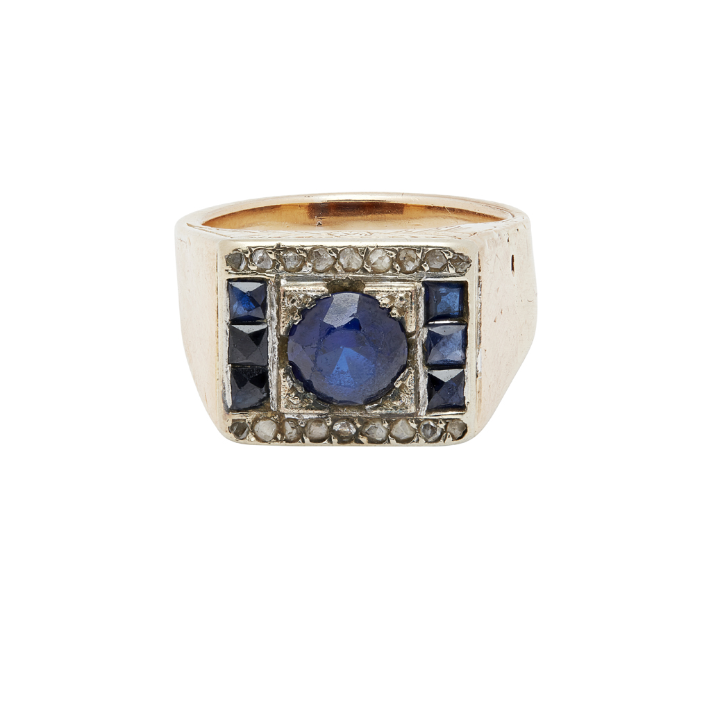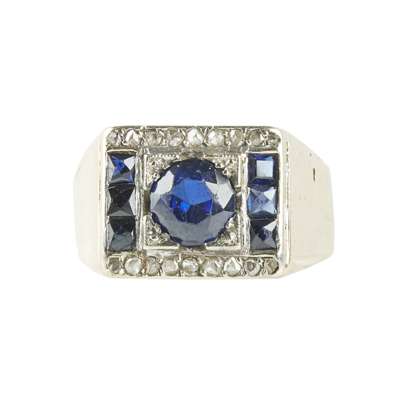 set with a round cut synthetic sapphire between two rows of three French-cut sapphires, flanked above and below by rose cut diamonds, engraved detail to gallery, French marks to outside of shank
