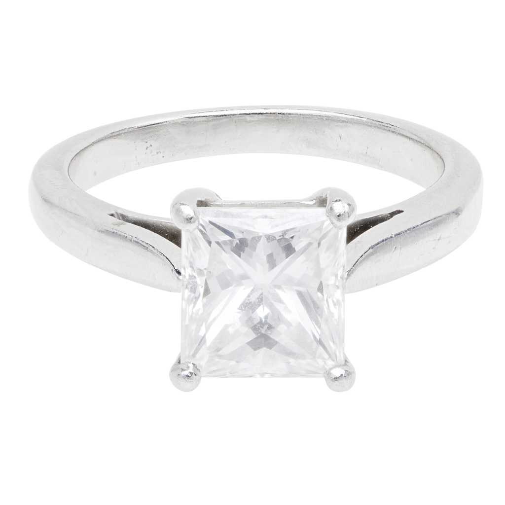 claw set with a princess cut diamond, to a plain platinum shank; with accompanying GIA report, dated 29.03.06, numbered 15059699, stating that the diamond is 2.08cts, D colour, VS2 clarity, showing no fluorescence
