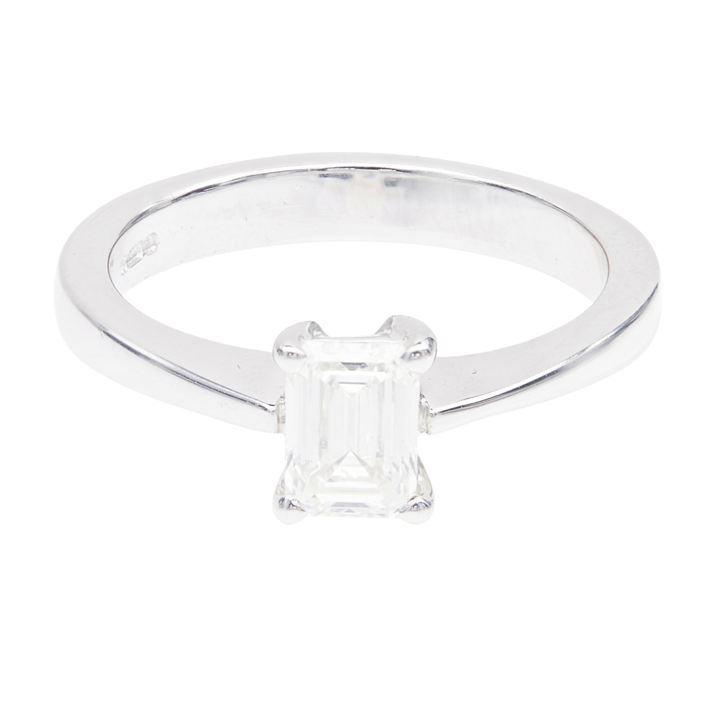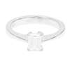 claw set with a single emerald cut diamond, to a plain 18ct white gold shank