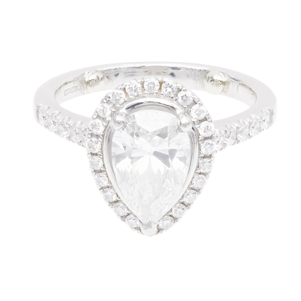claw set with a pear shaped diamond, in a single border of smaller round-brilliant cut diamonds, each shoulder set with six small round-brilliant cut diamonds, to a plain platinum shank; with accompanying GIA report, dated 21.08.02, numbered 12245694, stating that the principal diamond is 1.50cts, G colour, SI1 clarity, showing no fluorescence