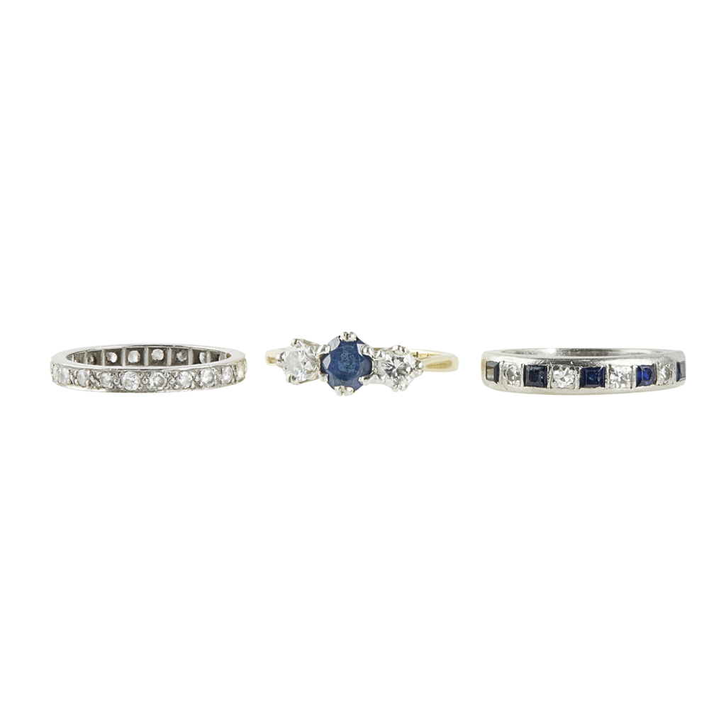 to include a sapphire and diamond set three stone ring, to a plain yellow metal shank stamped 18ct PLAT; together with an 18ct white gold sapphire and diamond set half eternity ring and a diamond set eternity ring (3)