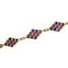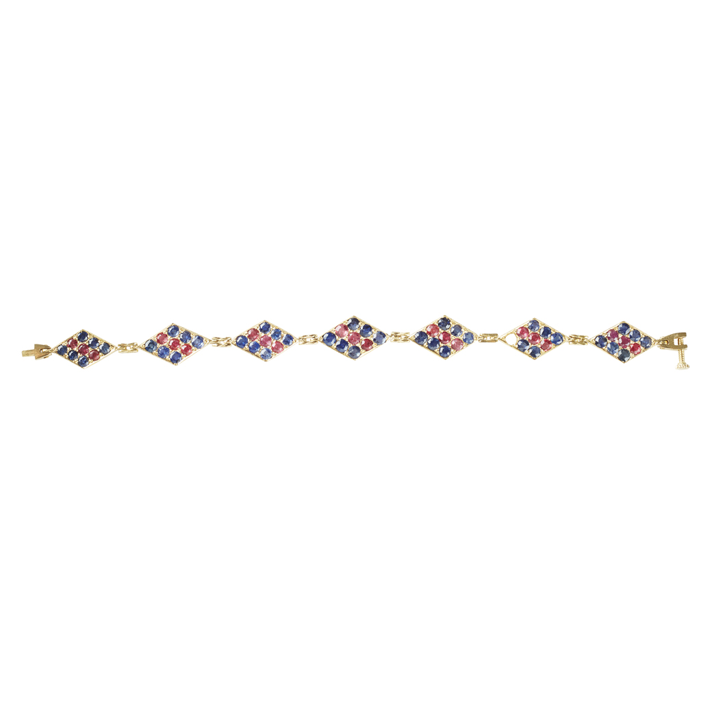 composed of seven lozenge shaped panels, each set with six round cut sapphires and three round cut rubies, modelled in unmarked yellow metal, with a screw clasp