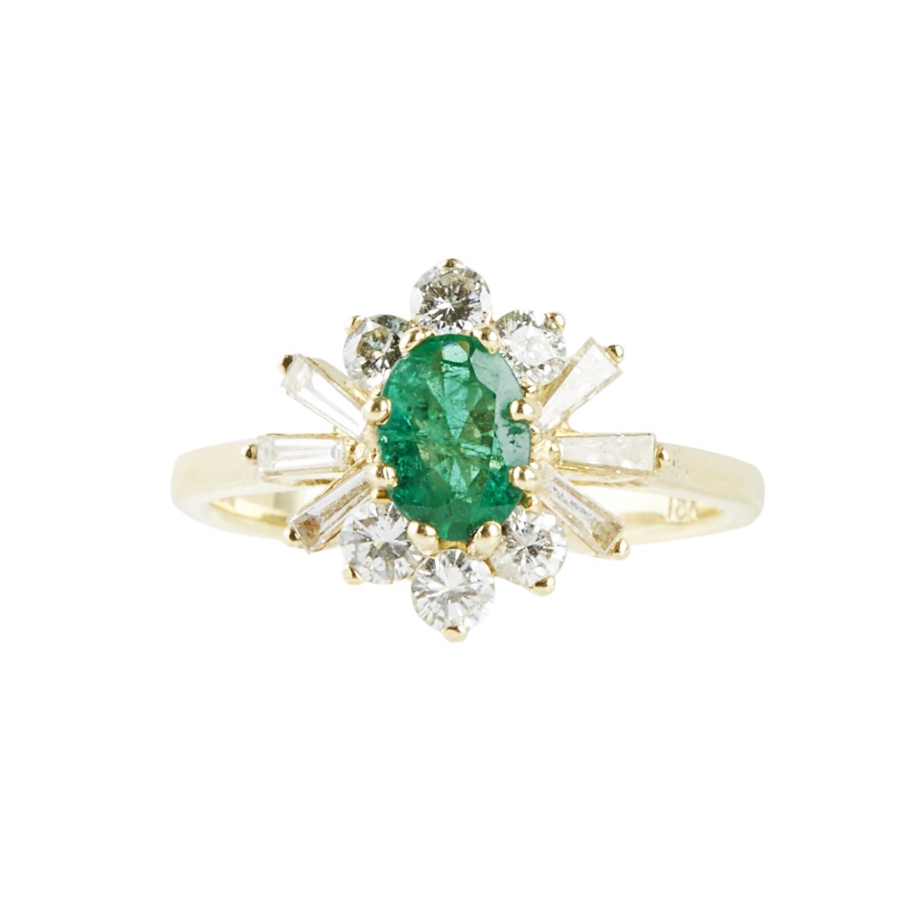 claw set with an oval cut emerald, in a border of six round-brilliant cut diamonds and six baguette cut diamonds, to a plain shank, stamped 18k