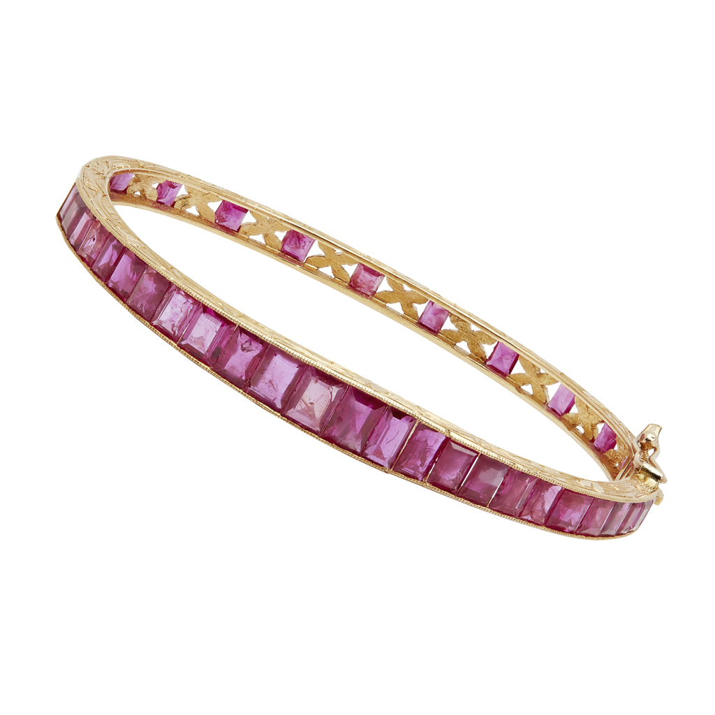 of hinged design, channel set with a tapered row of square and baguette cut rubies, the rear half alternately set with bright cut detail and square cut rubies, with engraved detail to sides, unmarked