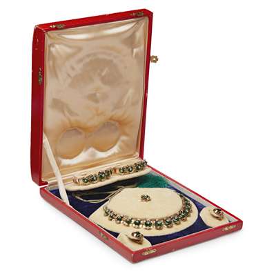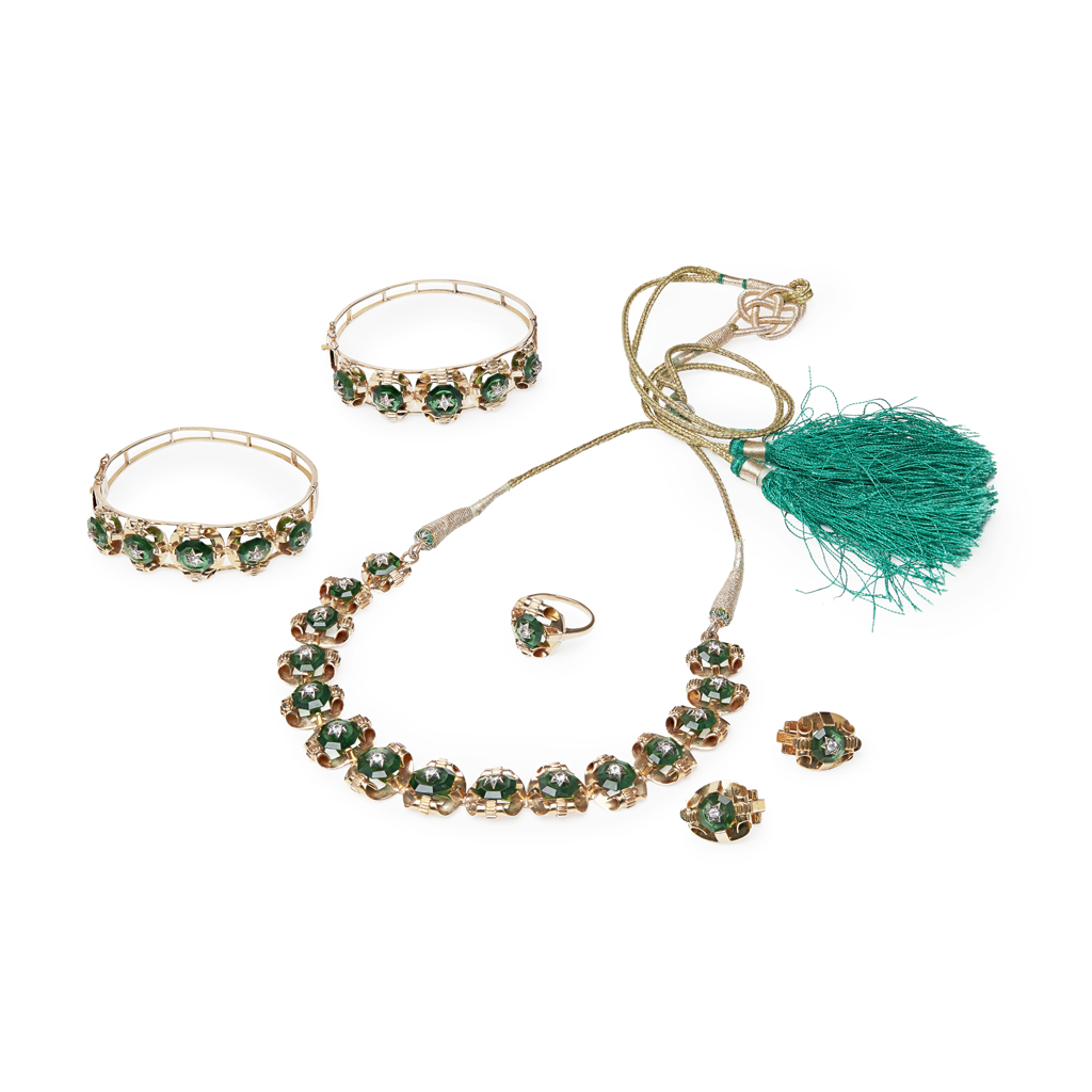 comprising a necklace, ring, two bangles and a pair of earrings; each set throughout with hexagonal cut green pastes with onset white paste star detail, ring and bangle stamped 18c, in a fitted box