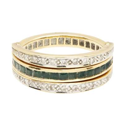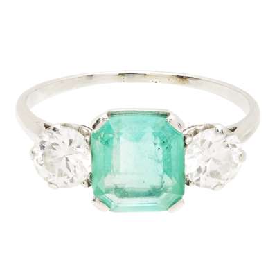An emerald and diamond set three stone ring
