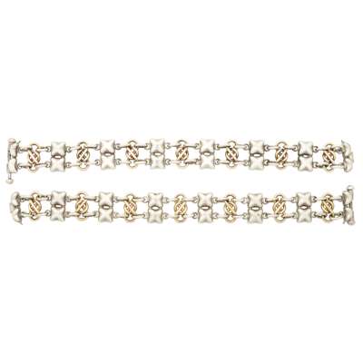 A cased pair of silver and gold bracelets