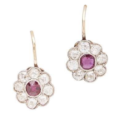 A pair of ruby and diamond set cluster earrings