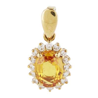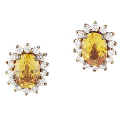 comprising a ring, pendant and a pair of earrings, each claw set with a modified cushion cut or an oval mixed cut sapphire within a cluster of round brilliant diamonds, stamped 14K (3)