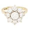 claw set with a round brilliant cut diamond, in a border of eight smaller round brilliant cut diamonds, to a plain 18ct gold shank