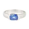 tension set with a cushion cut sapphire, within a matted and polished white metal shank, stamped '18K WG'