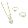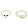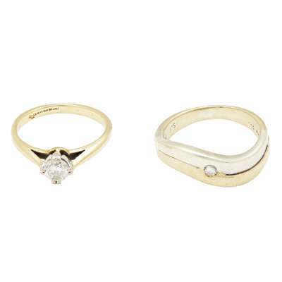 to include a single stone diamond ring, claw set with a round brilliant cut diamond, to a plain 18ct gold shank; together with a 9ct two tone wedding band collet set with a round brilliant cut diamond, and a diamond set pendant, modelled as a heart and set with three round cut diamonds (3)
