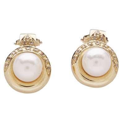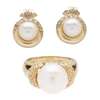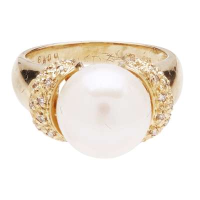 the ring set with single cultured Akoya pearl, each raised shoulder pavé set with small eight-cut diamonds, to a plain shank stamped 585; together with a pair of associated cultured pearl and diamond set earrings, to post and clip fittings (2)