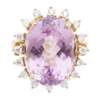 claw set with a large oval mixed cut pink kunzite, in a border of round brilliant cut diamonds, to a plain 18ct gold shank