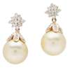 each composed of a cluster of nine round brilliant cut diamonds, suspending a golden cultured pearl from a diamond set mount, to post and butterfly fittings, stamped 14k