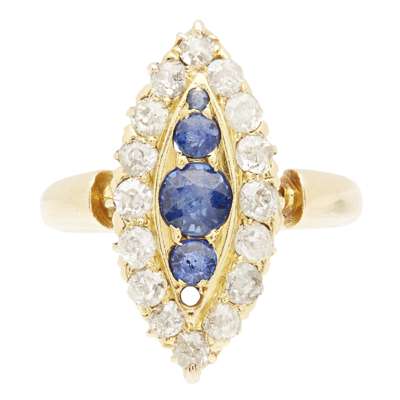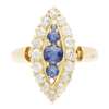 of navette outline, claw set with a row of five graduated sapphires (one deficient), in a single border of old round cut diamonds, to a plain 18ct gold shank