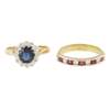 the round mixed cut sapphire within a surround of round brilliant cut diamonds, to a plain shank stamped 18ct; together with a half eternity ring channel set with rubies and diamonds (2)