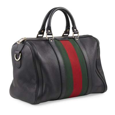 black leather, with green/red canvas insert, additional shoulder strap, internal zip pocket