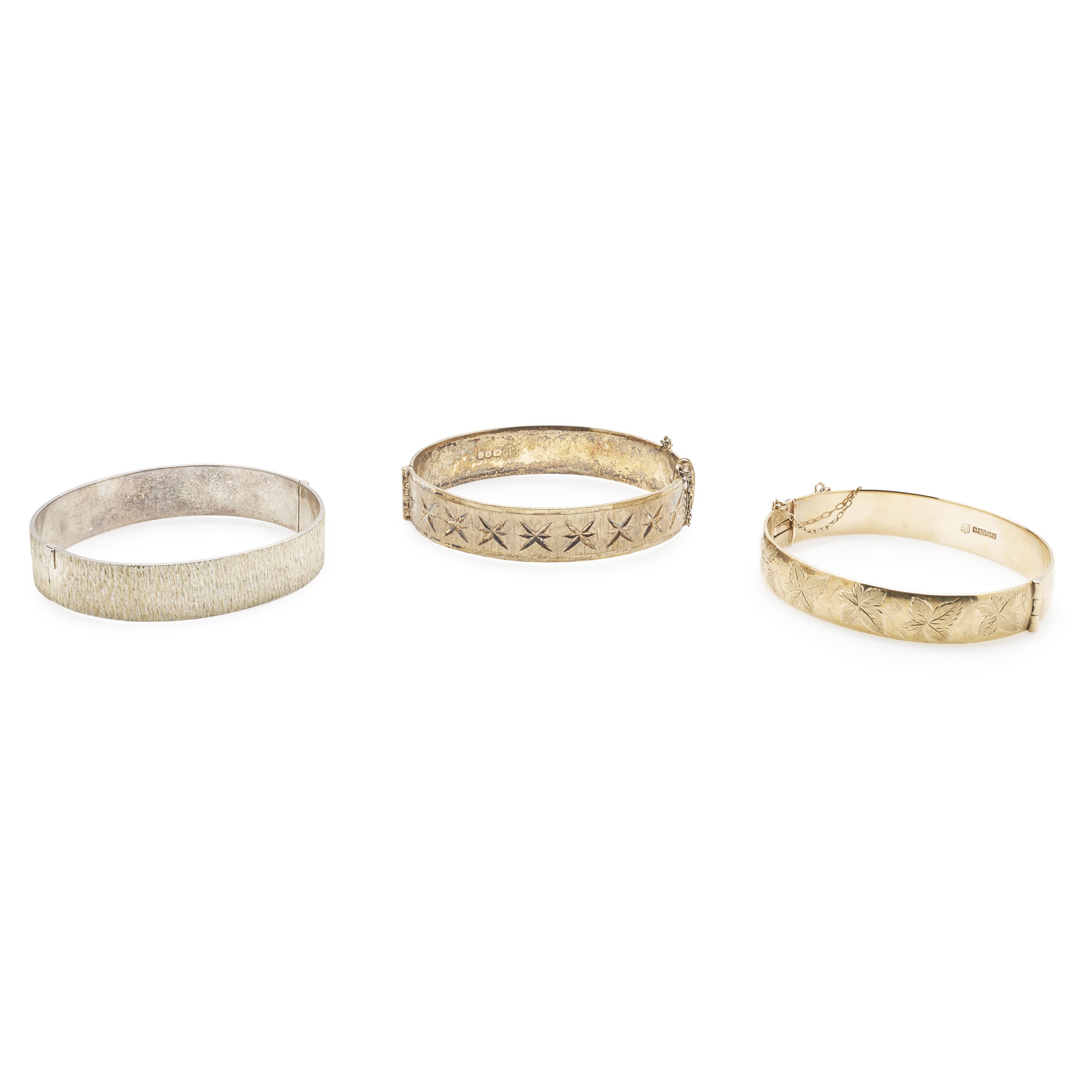 of hinged design with bright cut foliate detail, together with a hinged silver and silver gilt bangle (3)
