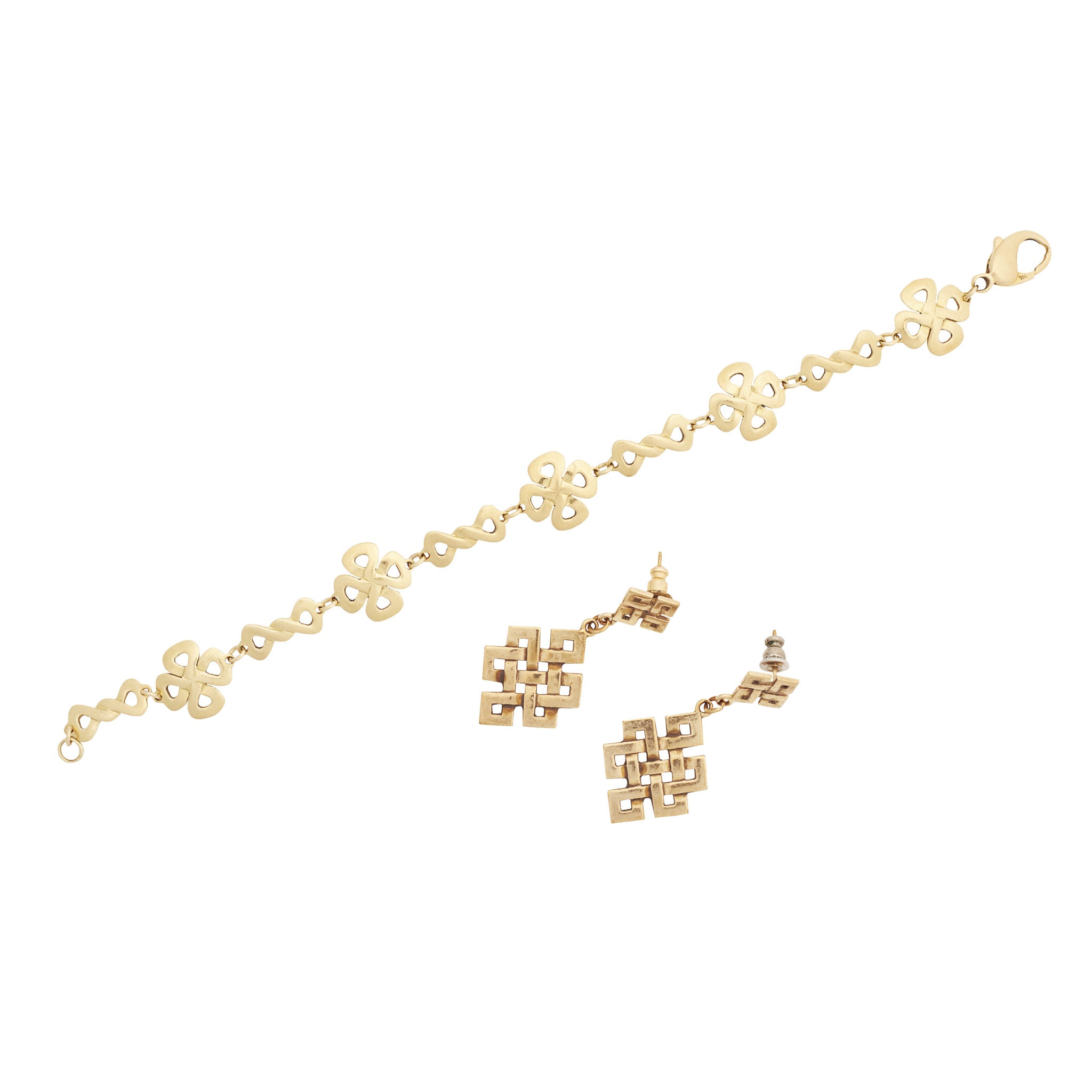 each set with two woven interlace plaques, to post and butterfly fittings; together with an 18ct floral and bow bracelet (2)