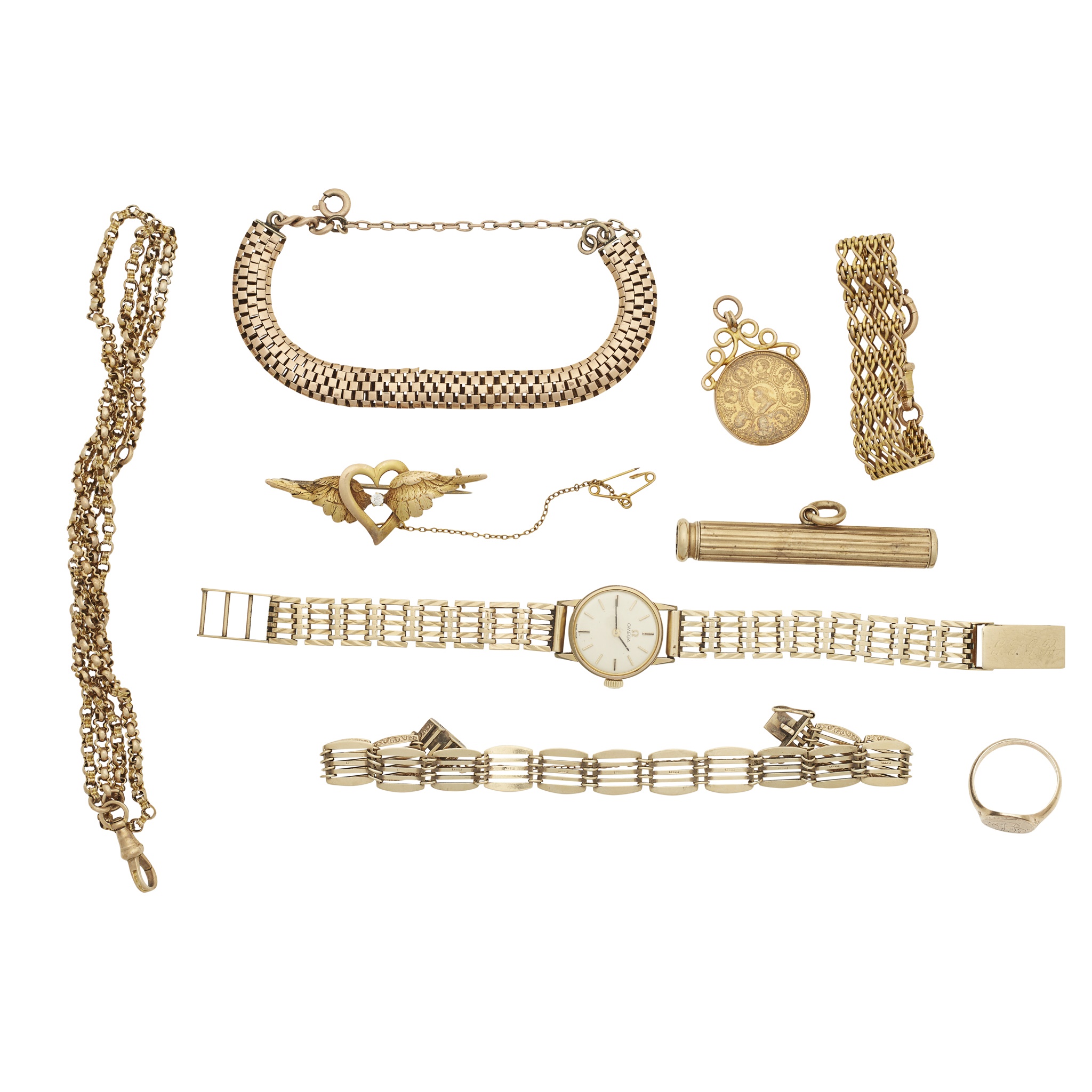 to include a 9ct gold gate link bracelet, a 9ct gold signet ring; a lady's Omega wrist watch to a 9ct gold bracelet, a 9ct gold mounted Queen Victoria Jubilee gilt medallion; together with a fancy link chain stamped 9c, a fob chain stamped 9c; a propelling pencil, unmarked, a yellow metal bracelet and a winged heart brooch (qty)
