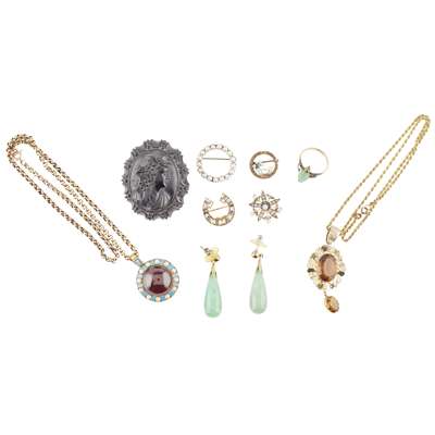 to include a citrine set pendant necklace, a pair of jade set pendant earrings; a pearl, paste and turquoise enamel set pendant necklace; a jade set ring and various gem set brooches (9)