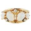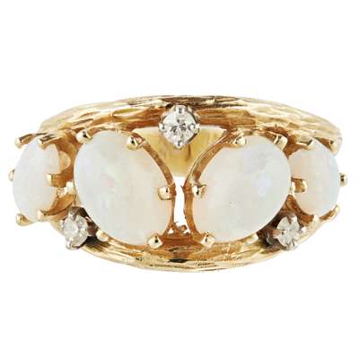 to include a five stone opal set ring, set at intervals with diamond chip detail, unmarked; a 1970s opal and diamond set ring with textured detail and a blue zircon and diamond set ring (3)