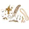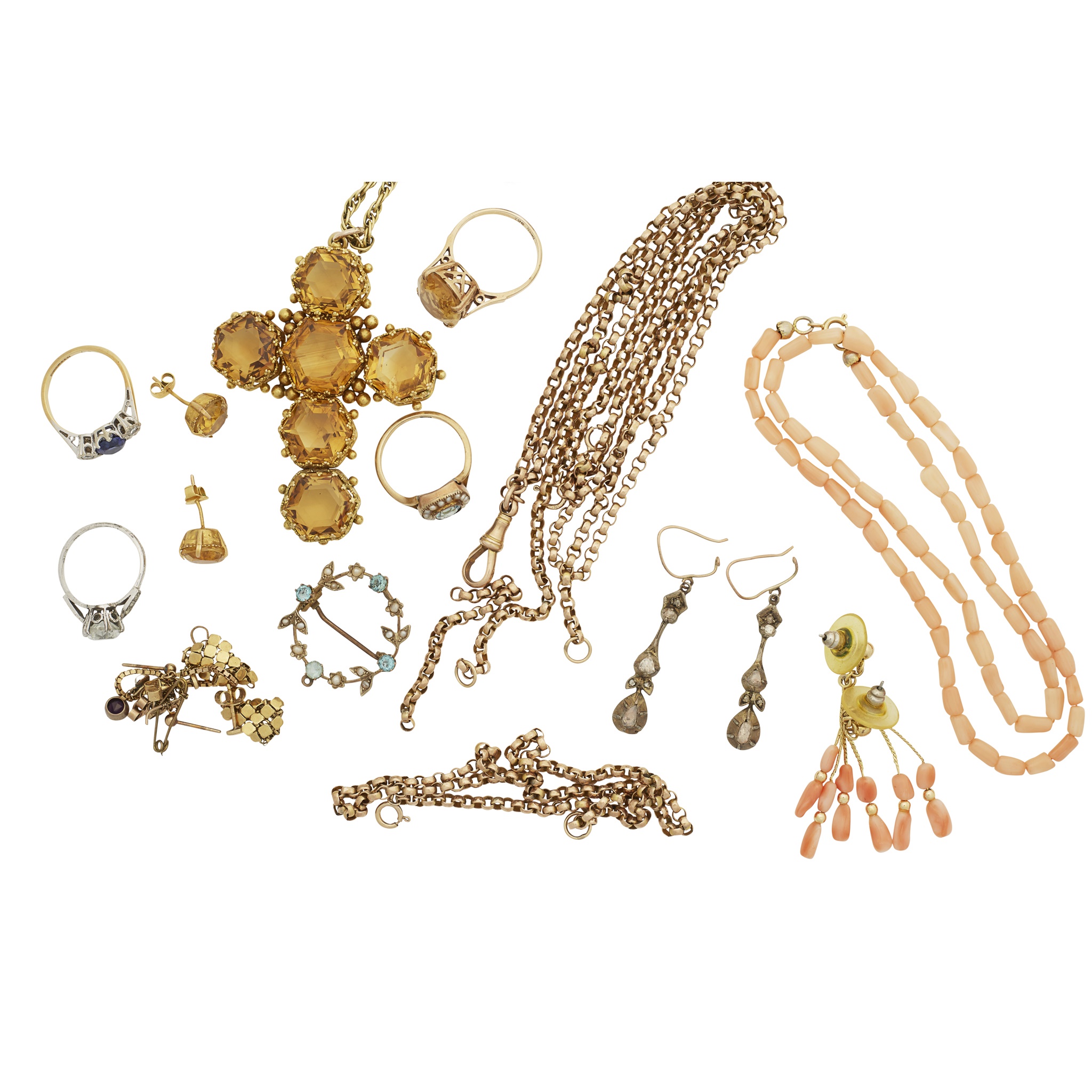 to include a large citrine set pendant cross, to a gilt metal chain; a coral necklace and matching pendant earrings, a citrine set cocktail ring, stamped 9ct; three unmarked belcher link chains and a bracelet; various other gem set rings, brooches etc. (qty)