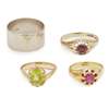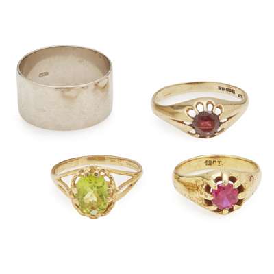 to include a broad 18ct white gold wedding band, a 9ct gold peridot set ring; a 9ct gold garnet set ring and a synthetic ruby set ring, stamped 18ct (4)