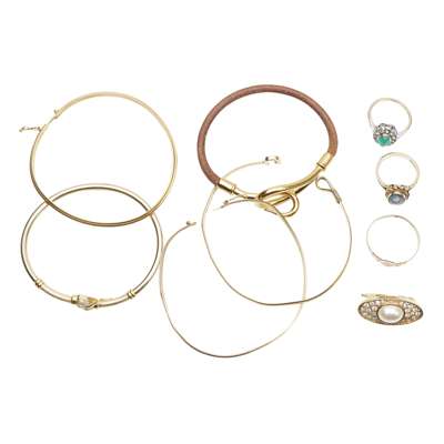 to include an Hermès jumbo hook bracelet, stamped HERMES; together with a 9ct opal set ring, a paste set cluster ring; a signet ring stamped 9ct; together with various bangles and a costume pearl brooch (qty)