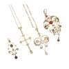 to include a seed pearl and peridot set pendant, stamped 15ct; an opal and seed pearl set pendant, stamped 9ct, to a 9ct gold fetterlink chain; a seed pearl and garnet set pendant necklace and another smaller stamped 9ct (4)