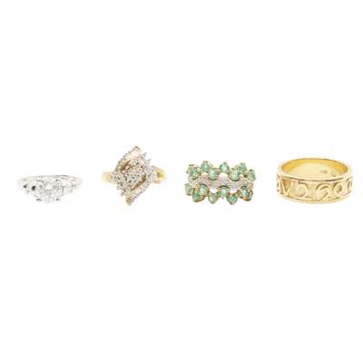 to include a 9ct emerald and diamond set cluster ring; a 9ct gold diamond set cluster ring; a platinum and cubic zirconia set ring; and a welsh gold ring, embossed characters, stamped 18ct (4)