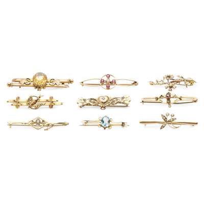to include a 9ct gold citrine set bar brooch, and another with gem set swallow motif; four further gem set bar brooches, stamped 9ct and another unmarked; two gem set bar brooches stamped 15ct (9)