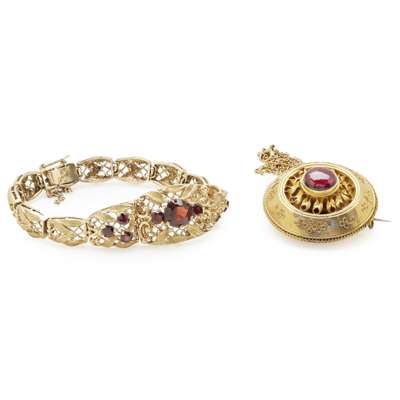 composed of pierced graduating rectangular links, the central three each set with three graduated mixed cut garnets, to a concealed clasp and safety chain; together with a Victorian Etruscan revival brooch, collet set with a paste in a scrolling border and further border with applied floral detail, reverse with glazed panel with plaited hair, apparently unmarked, associated chain (2)