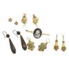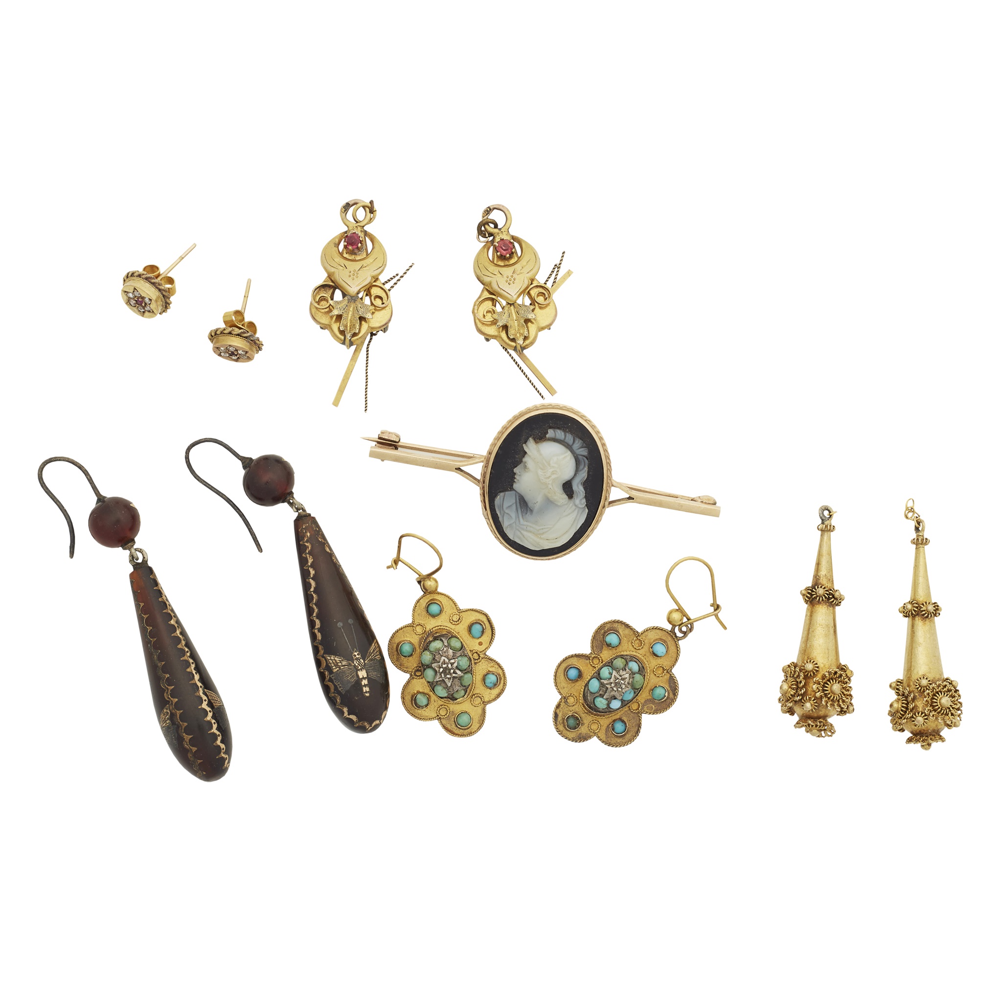 to include a hardstone cameo set bar brooch, a pair of tortoiseshell pique work pendant earrings; a pair of diamond and ruby set cluster studs, a pair of pendants with wire-work detail and two pairs of gem set pendant earrings (6)