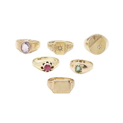 to include two 9ct gold gentleman's diamond set signet rings, and another plainer example; a 18ct gold emerald set ring, an unmarked amethyst set ring; and a synthetic ruby set ring, stamped 18ct (6)