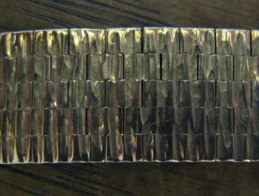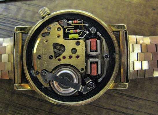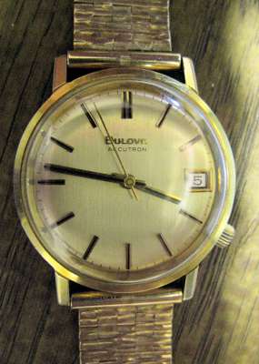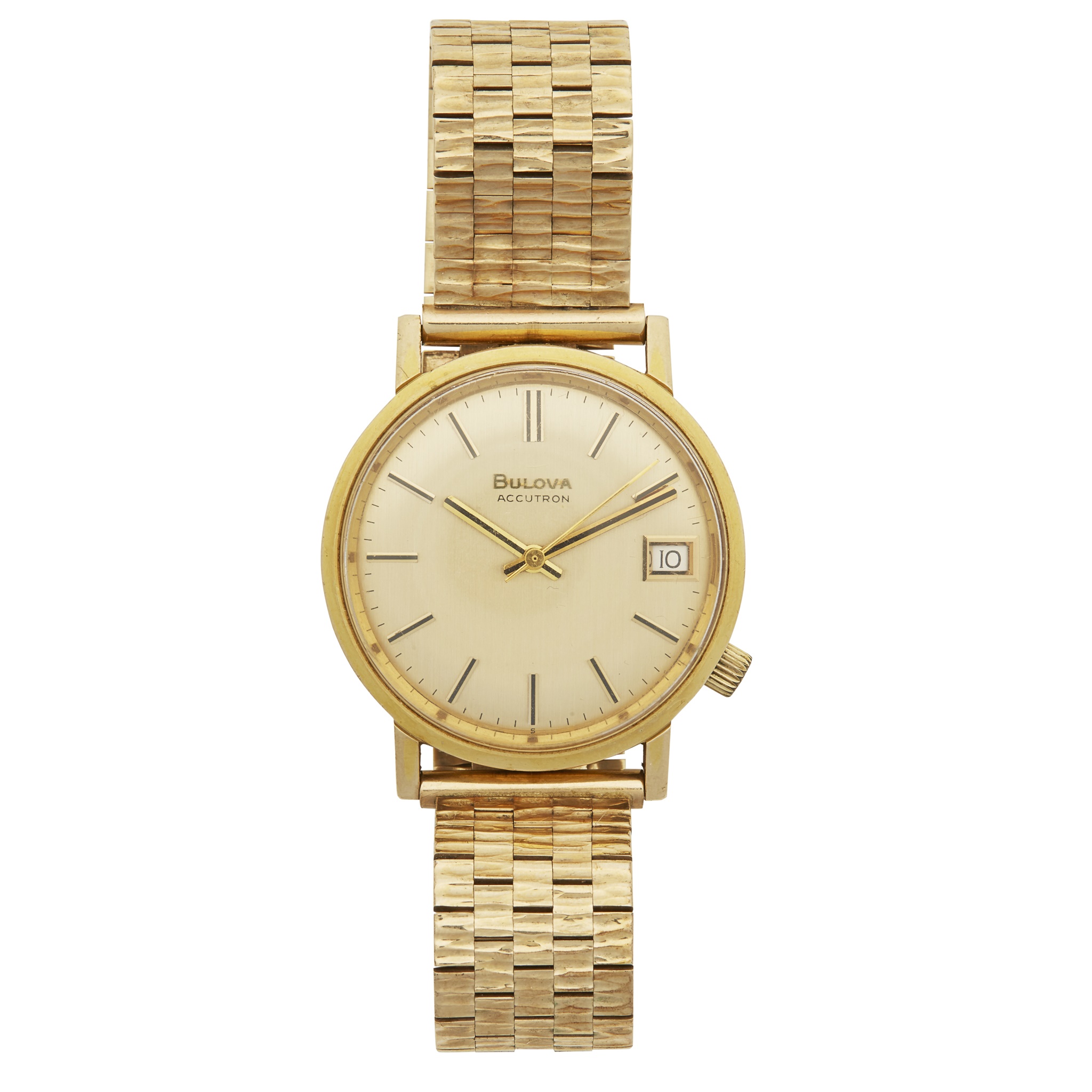 Accutron, champagne dial, baton indicators, sweep second hand, date aperture, off set crown, plain case with a 9ct gold flexible textured bracelet, fold over clasp
