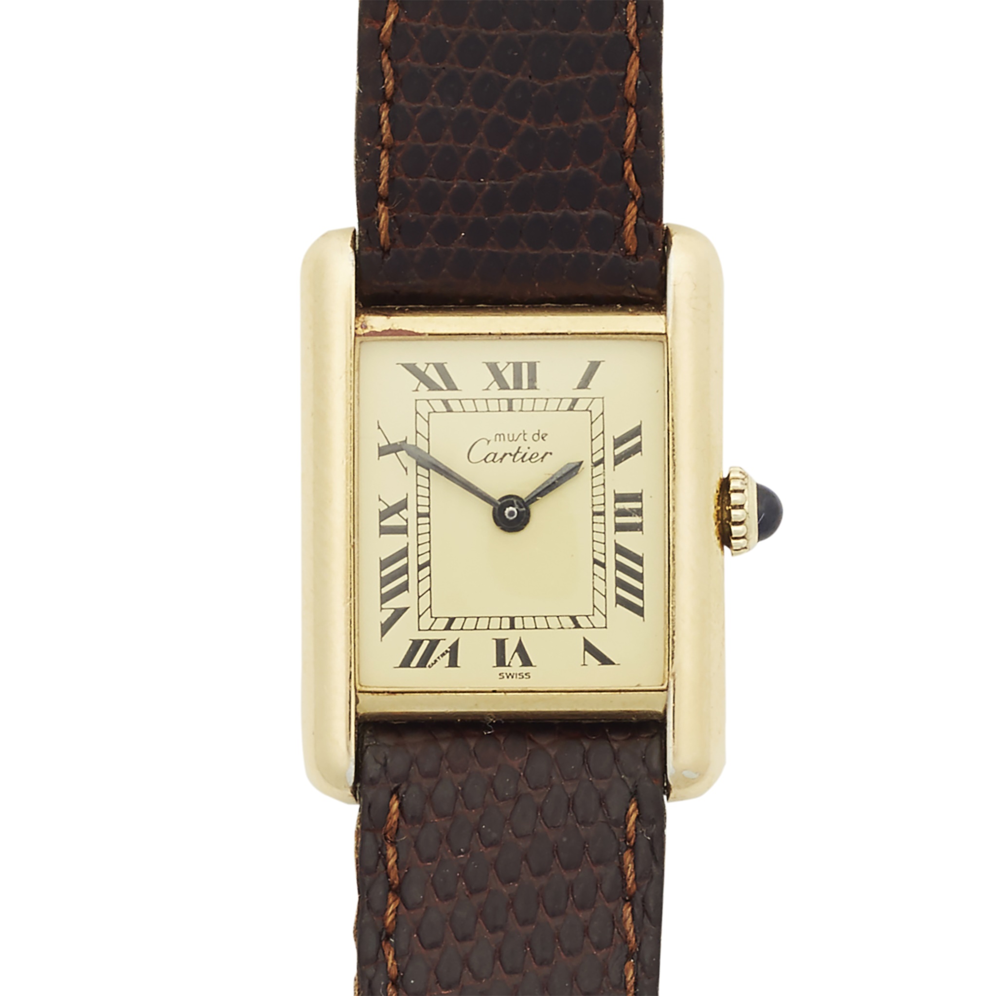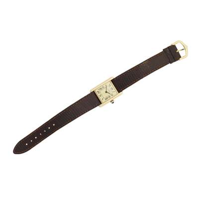 Tank Française, cream dial, Roman numerals, sapphire cabochon crown, leather strap, gilt buckle, with associated Cartier box