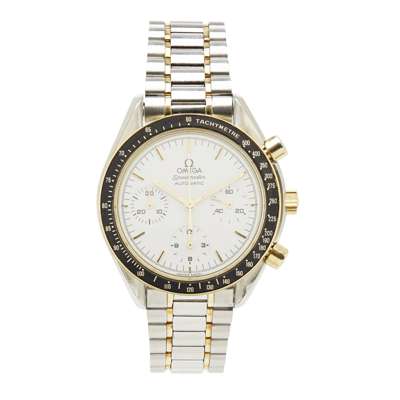 Speedmaster, white dial and register dials, black and gold bezel, gold collars to the crown and buttons, bracelet stainless steel with gold detailing and Omega gold insert to the buckle